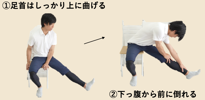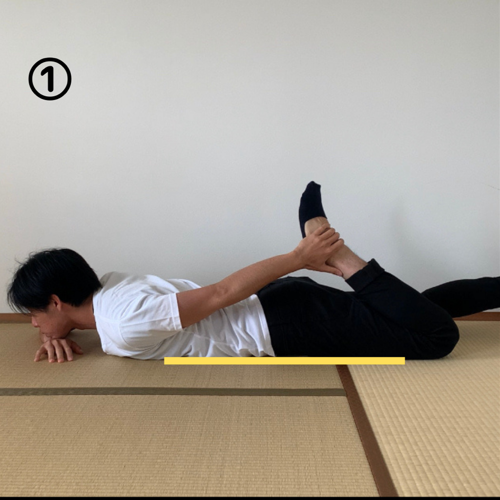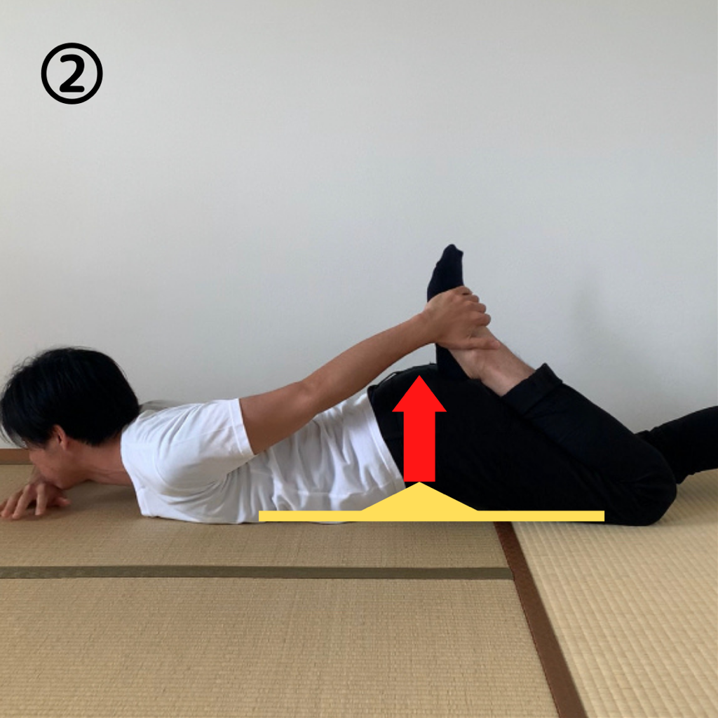 ストレッチの方法は①のようにお尻が浮かないように膝を曲げていきます。