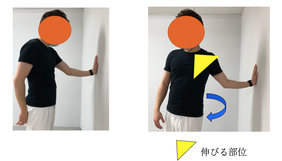 壁に手をついた方とは逆方向に身体ごと回る。