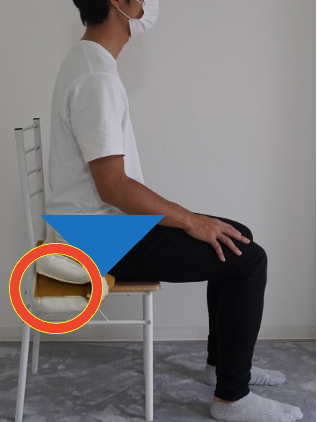 下の写真のようにクッションを座面の後ろ半分において座ってみてください。