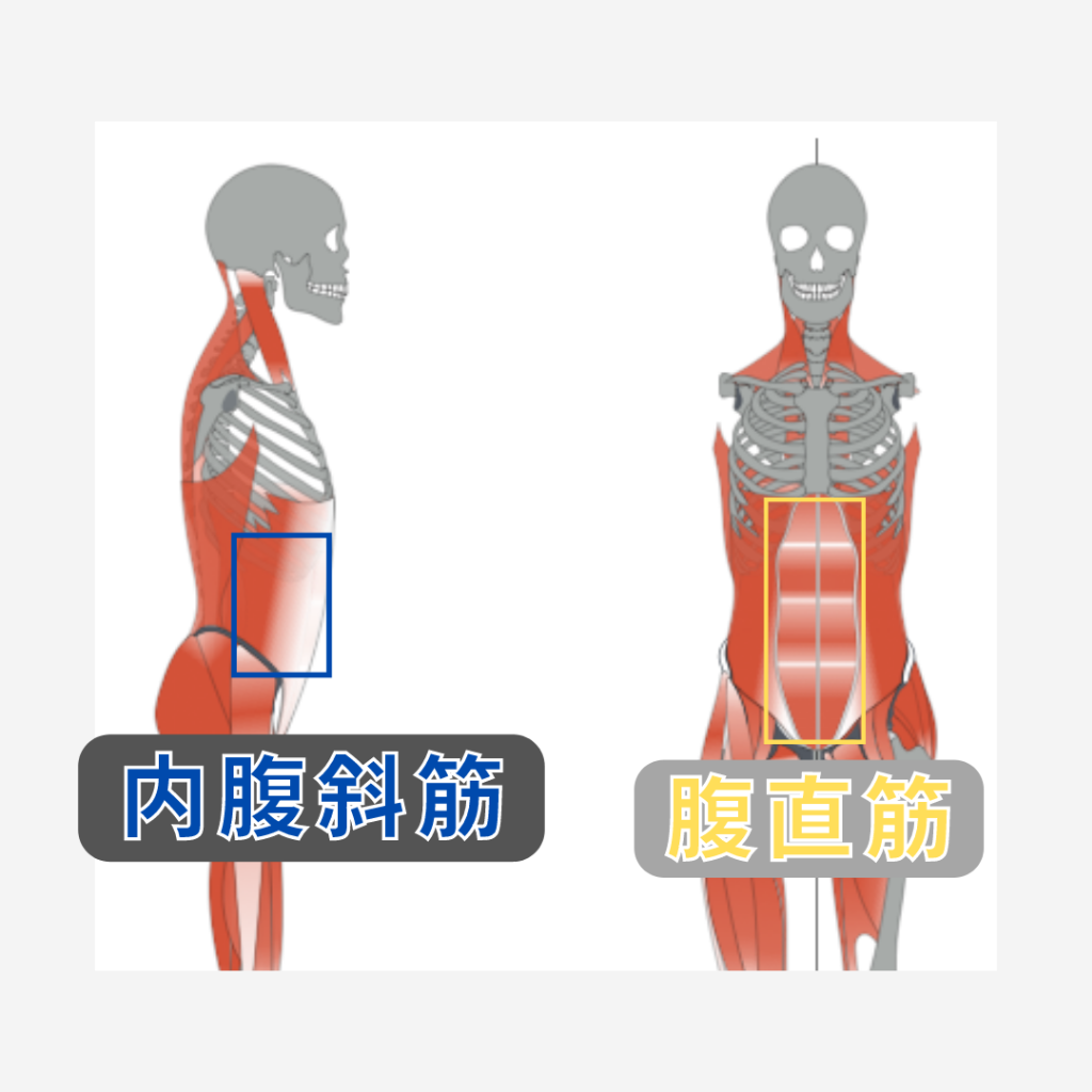 ※ここに図示できていませんが、腹横筋は内腹斜筋よりもさらに身体の内側にあり、お腹周りをぐるっと1周しています。