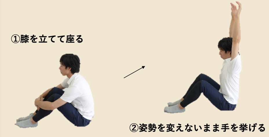 下のトレーニングは「内腹斜筋、腹横筋」を使いながら背中や肩周りの動きを加えることで、動作の中でコルセットの役割が果たせるようにトレーニングを行います。